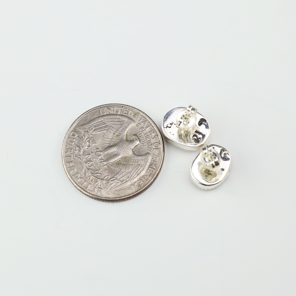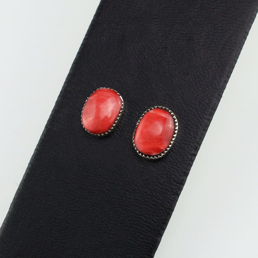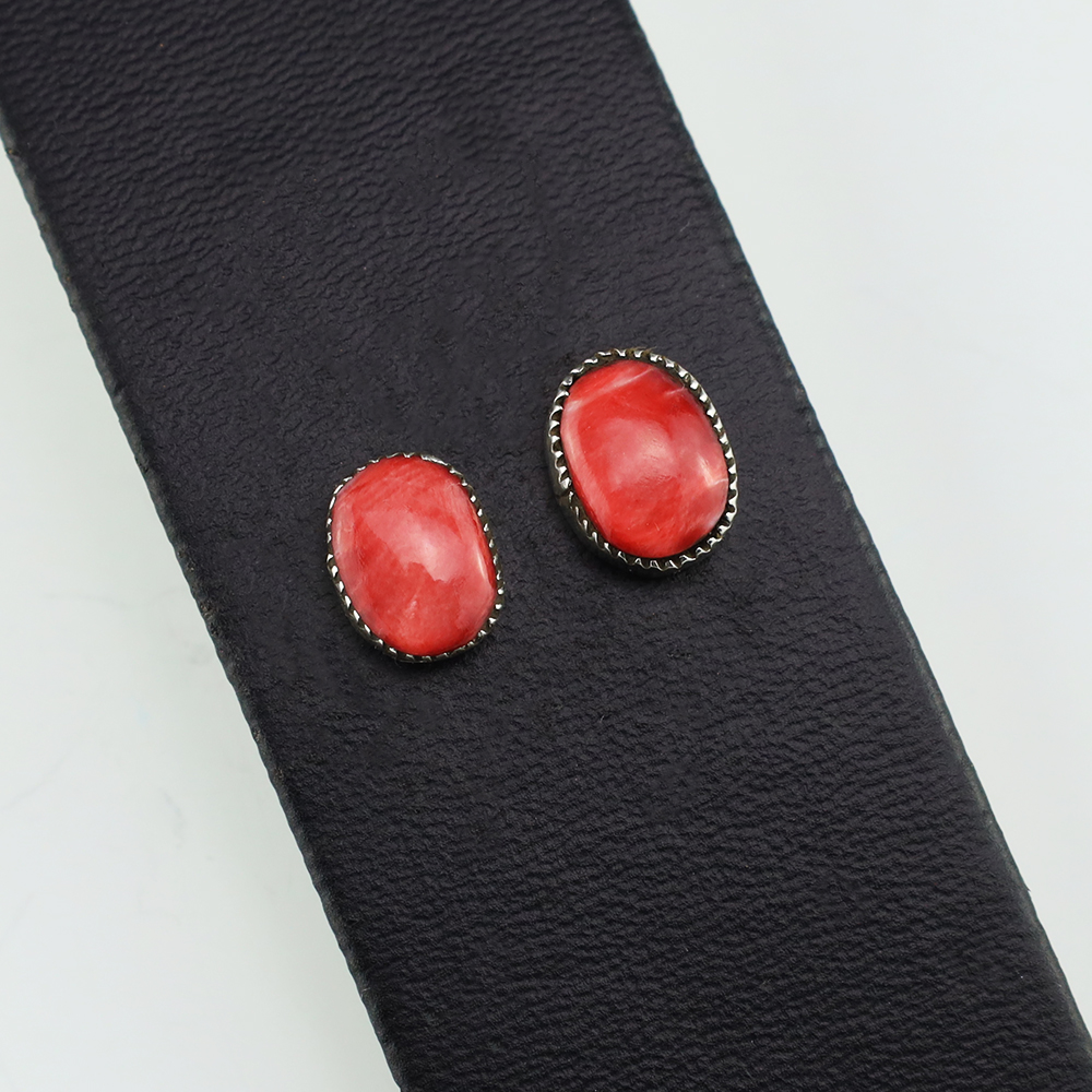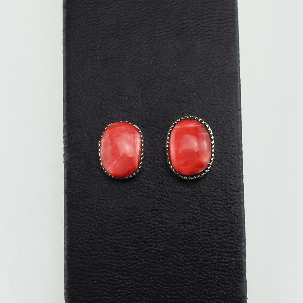 Zuni artist, Diane Lonjose created these lovely earrings. Made out of sterling silver and set with Spiny Oyster. The components are all hand fabricated and the stones are all natural. Diane comes from a family of Zuni jewelers. She is the daughter of Alice and Duane Quam, and grandchild of Doris and Warren Ondelacy. Weighs 2 gram. Signed