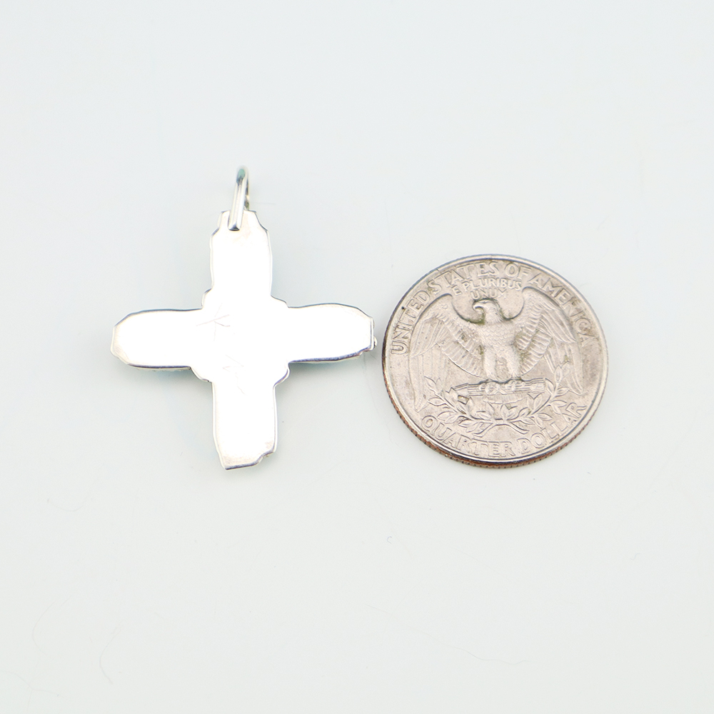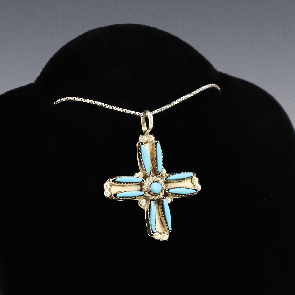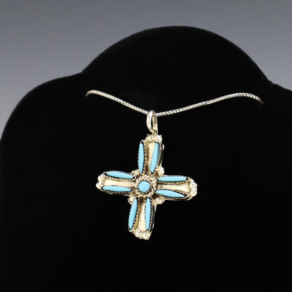 Beautiful cross pendant made out of sterling silver and Turquoise by Zuni artist Yvette Kaamasee. Zuni artists are known for their fine lapidary skills. Each stone is hand cut, polished, and set into a sterling silver setting. Weighs 4 grams. (Chain not included) Signed.