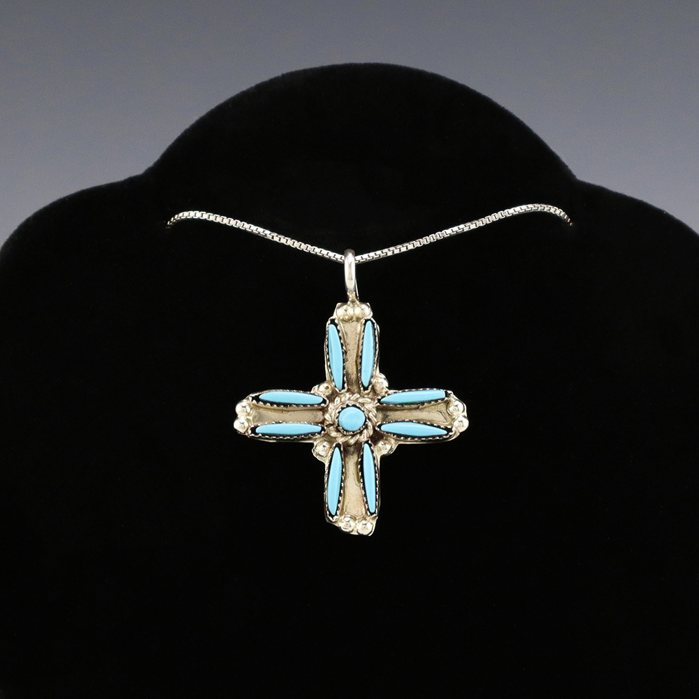 Beautiful cross pendant made out of sterling silver and Turquoise by Zuni artist Yvette Kaamasee. Zuni artists are known for their fine lapidary skills. Each stone is hand cut, polished, and set into a sterling silver setting. Weighs 4 grams. (Chain not included) Signed.