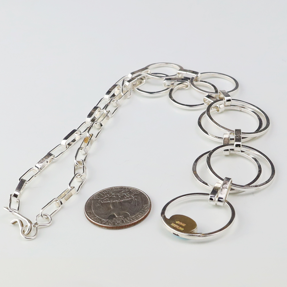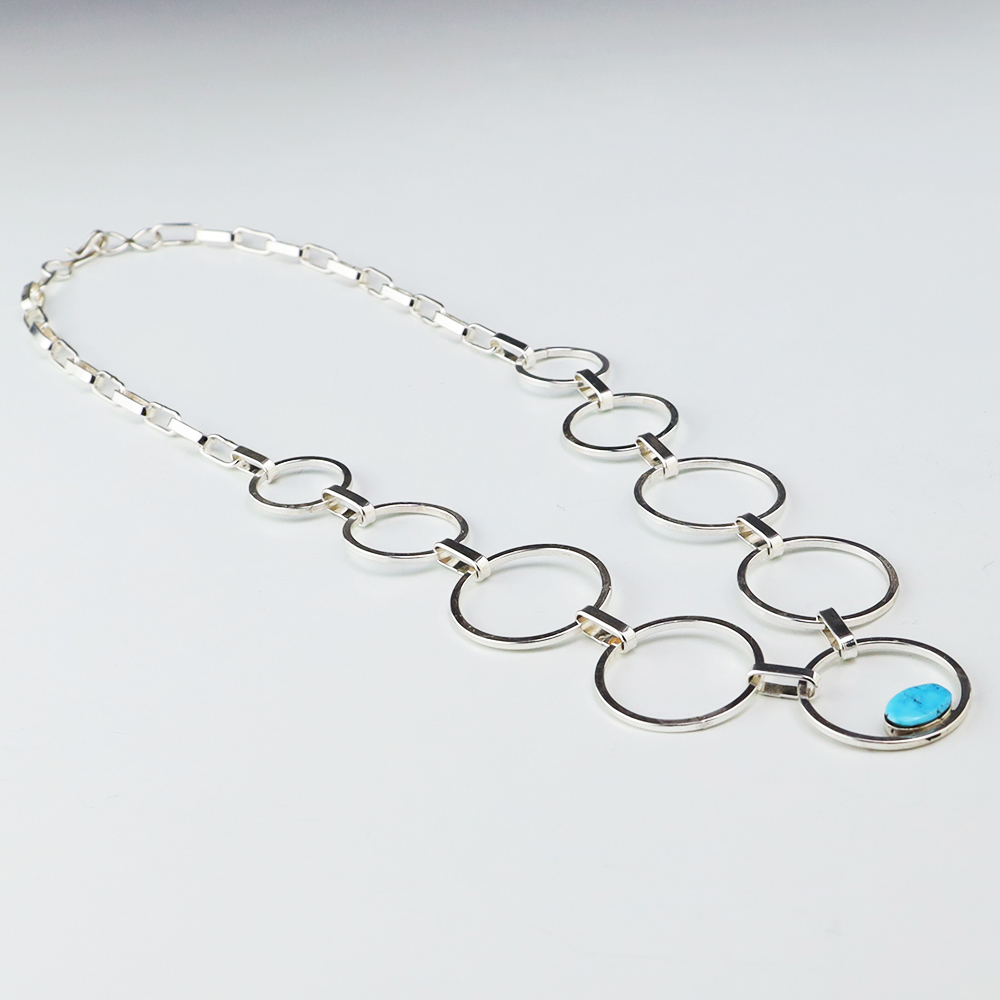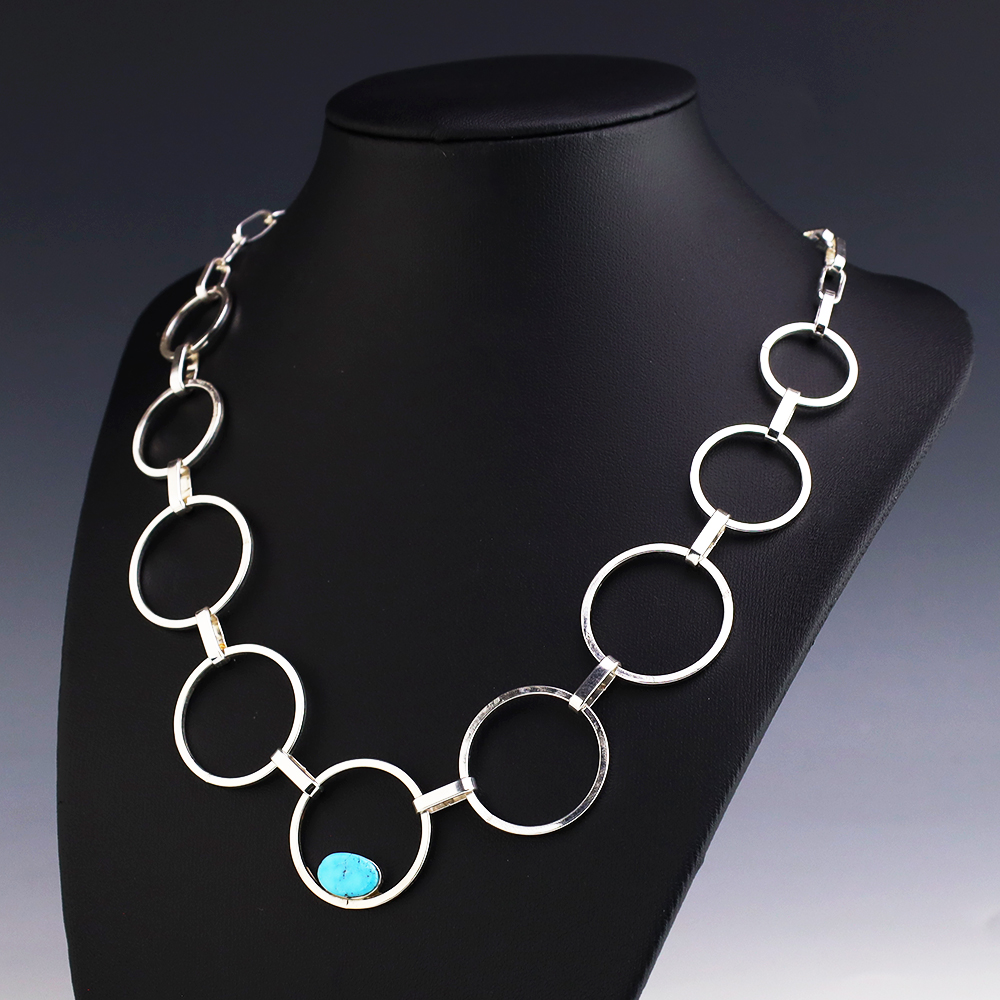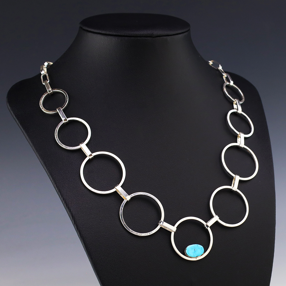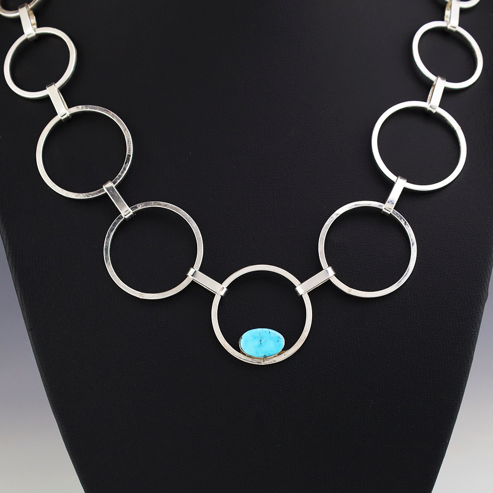Zuni artists Nancy and Sheldon Westika made this gorgeous necklace. Sterling silver with a Turquoise Stone. The Westikas are know for their great stone work. An exquisite statement piece that you will enjoy for many years. Weighs 28 grams. Signed