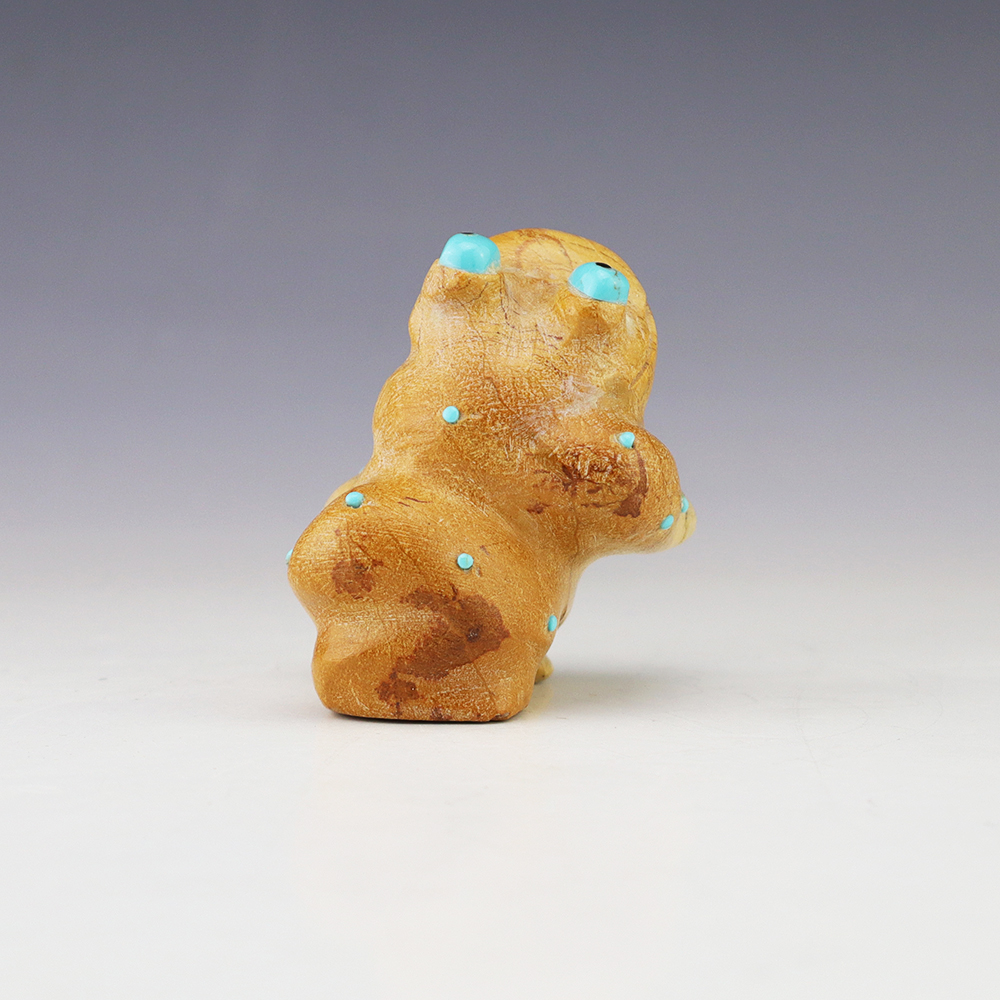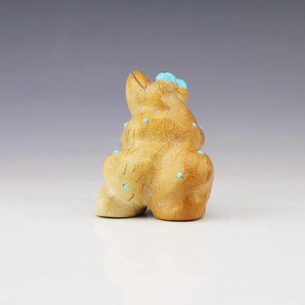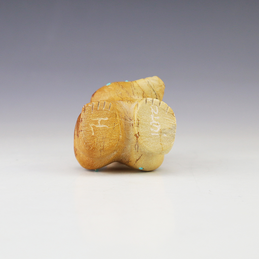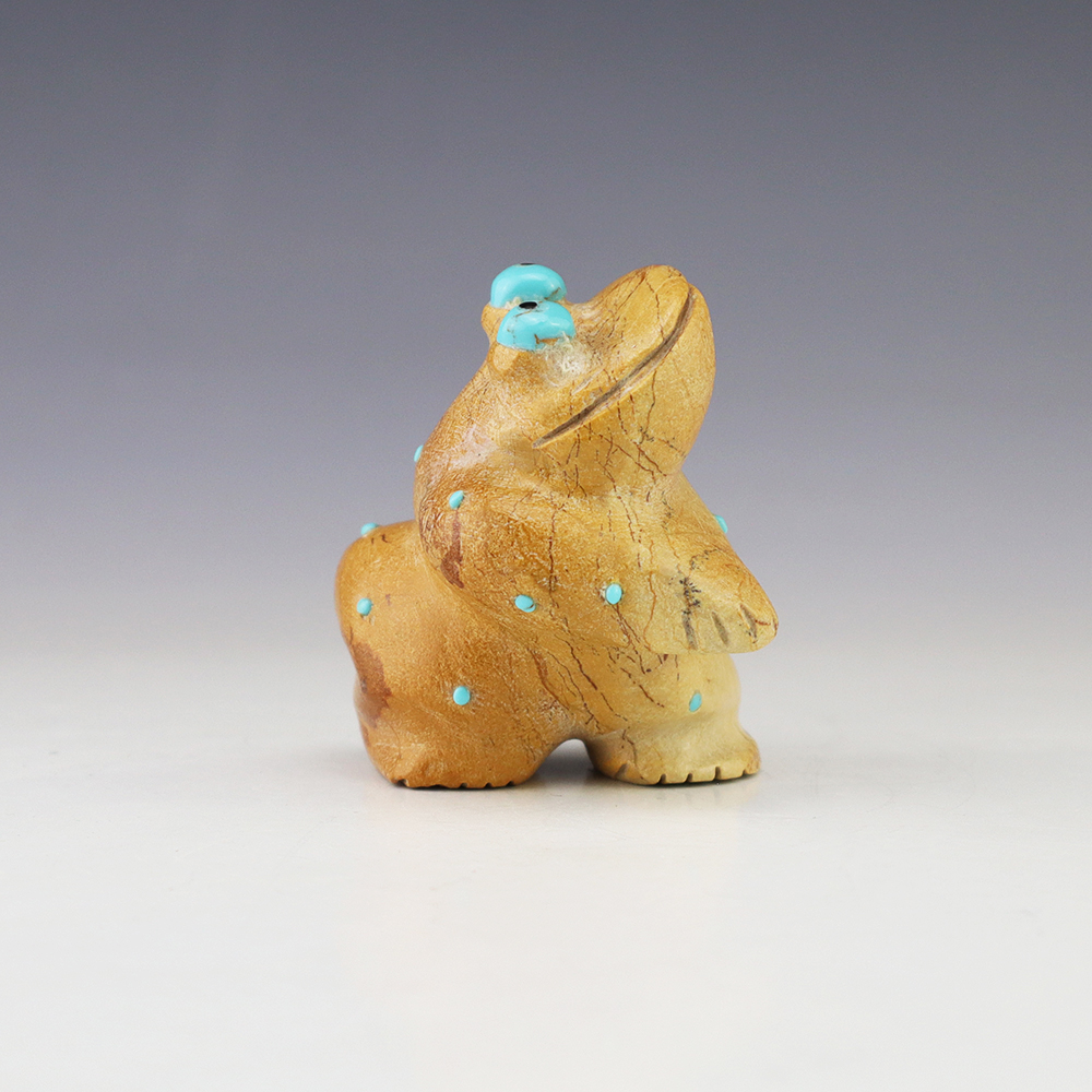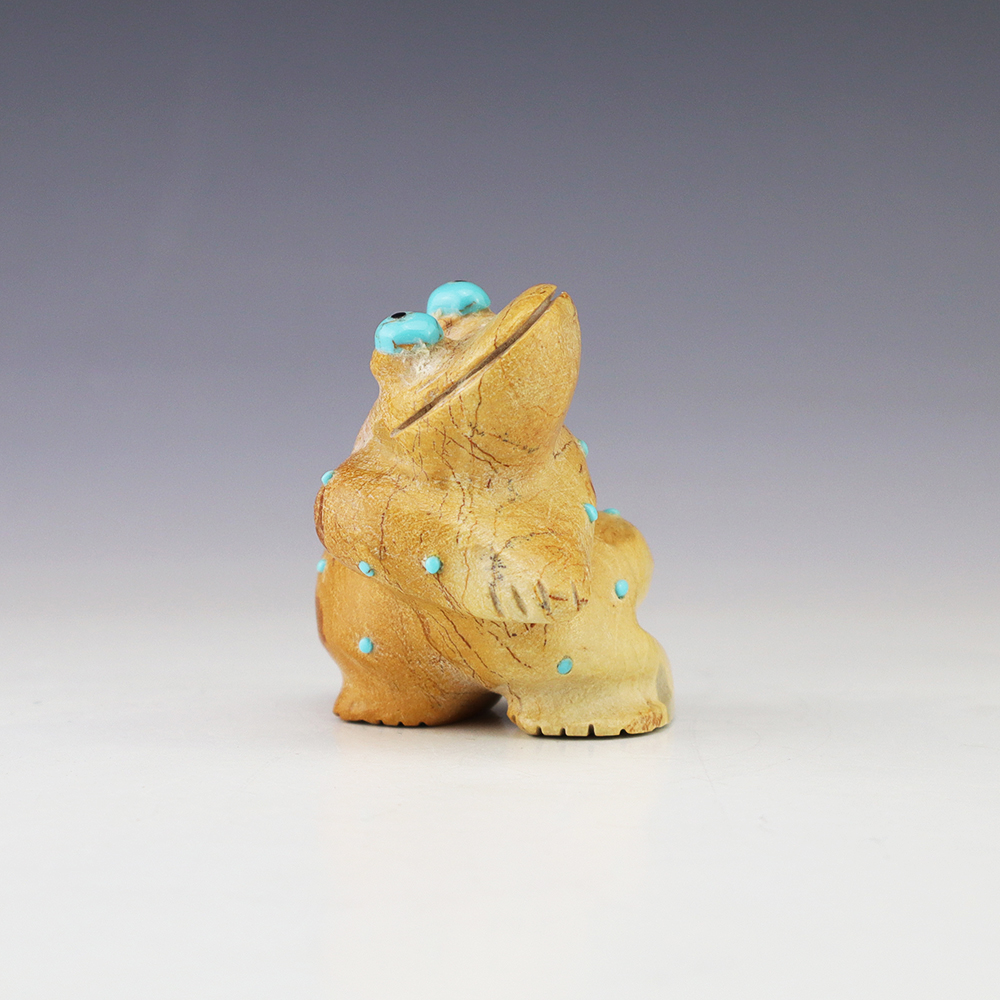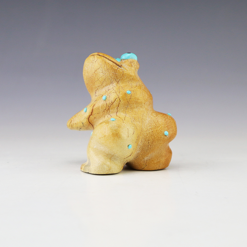 Zuni fetish artist Hayes Leekya comes from a family of carvers. This wonderful Frog is is an outstanding example of Zuni craftsmanship. Hand carved out Travertine (Zuni Rock) with Turquoise and Penn Shell eyes. In prehistoric times, frog carvings appeared in jewelry. Zuni frog fetishes are associated with rain, abundance, and fertility. A great addition to your Native American or Zuni fetish collection. Signed