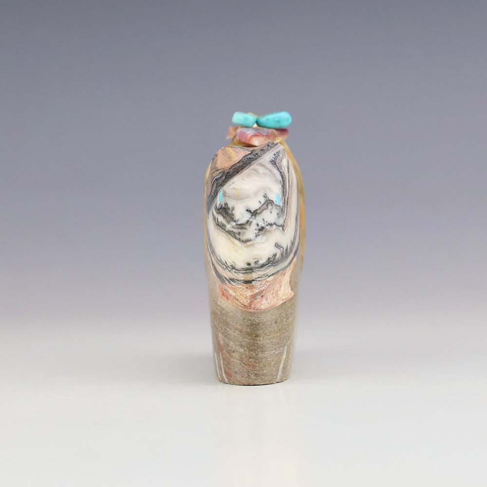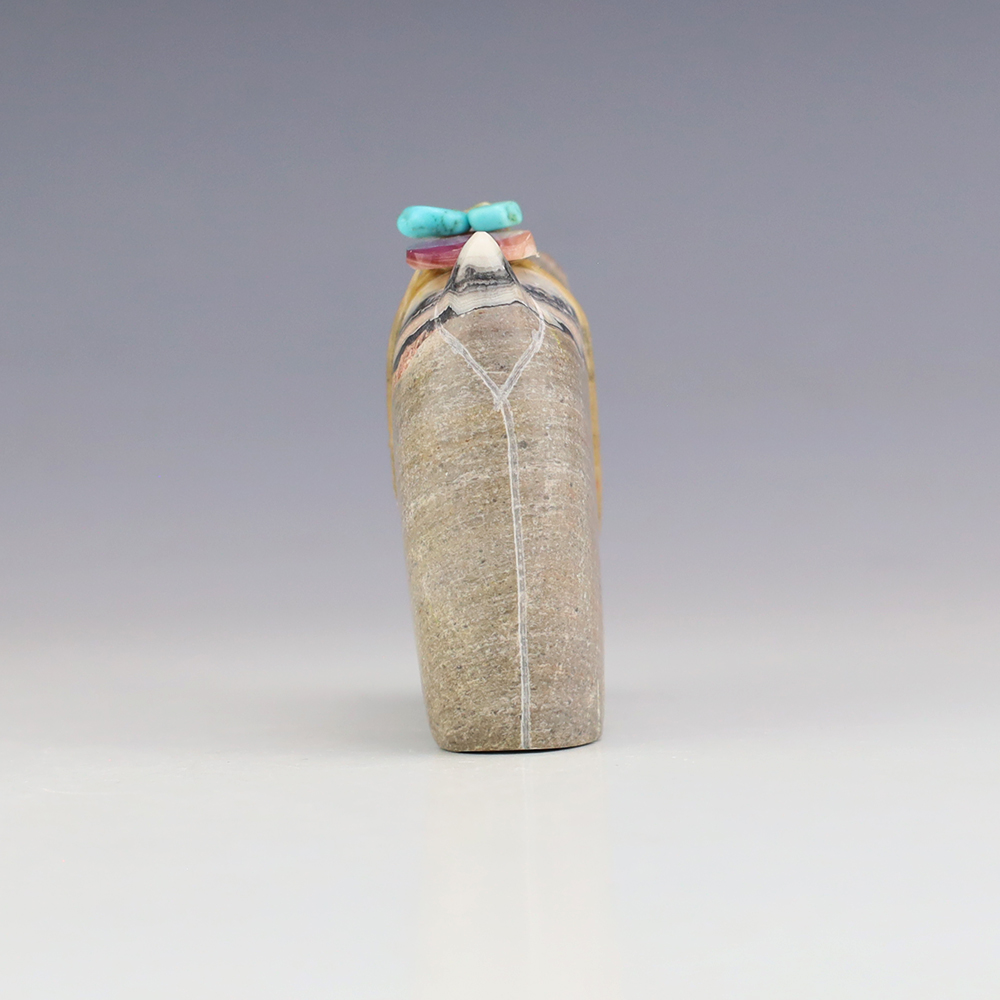 Zuni artist Gabe Sice hand carved this lovely maiden fetish. Made out of antler with intricate detail and inlaid with natural Sleeping Beauty Turquoise, Mediterranean Coral, and Penn Shell. (note-there is natural pits in the antler) This maiden would make a great addition to your Native American or Zuni fetish...