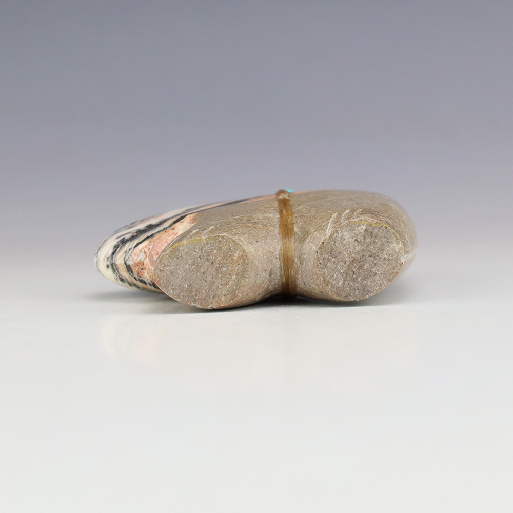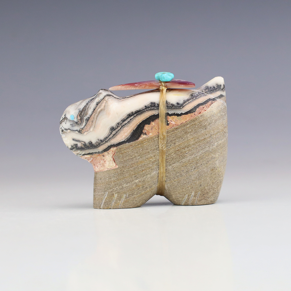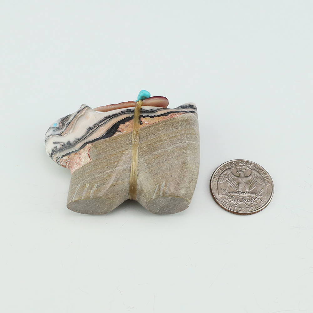 Zuni fetish artists Leland Boone and Daphne Quam made this outstanding Bobcat fetish. The carving is made out of Zebra Calcite and is bundled with Turquoise and Pink Mussel. This great carving would make a great addition to your Native American art or Zuni fetish collection.