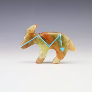 Zuni artists Leland Boone and Daphne Quam hand carved this wonderful fetish. The coyote carving is made out of Onyx and is bundled with Spiny Oyster and Turquoise. The coyote is the Hunter of the West. The coyote is respected for his knowledge and survival skills, if not for his...