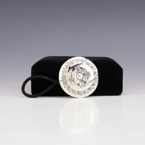 Great design! This ponytail holder is sterling silver and made by Navajo artist Genevieve Blackgoat. Navajo barrettes and ponytail holders look absolutely amazing in your hair. Weighs 4 grams. Signed 1 3/8″ in diameter Artist card included The Navajos began working with silver in the 19th...