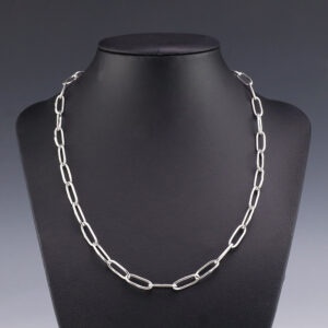 Zuni artist Carlo Lonjose made this fabulous paperclip chain. Sterling silver and a heavy gauge. An exquisite statement piece that you will enjoy for many years. The necklace weighs 84 grams. Signed 5/16″ wide x 3/4″ long-links 36” long-Necklace Artist card included Zuni Pueblo is the largest pueblo...