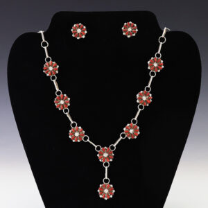 NATIVE AMERICAN ZUNI CORAL NECKLACE & EARRINGS BY DAVID & SARITA LEEKITY