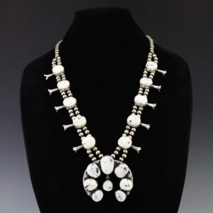 This gorgeous sterling silver squash blossom necklace was created by Navajo artist Thomas Francisco. The squash blossoms and the naja are set with White Buffalo stones. The necklace is strung with sterling silver 7 mm beads. The necklace is finished off with a sterling silver hook and eye, and the...