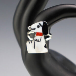 Zuni artist Shenel Comosona made this fabulous Snoopy ring. Zuni artists are known for their fine lapidary skills. Each stone is hand cut, polished, and set into a sterling silver setting. The ring is inlaid with Coral, Mother of Pearl Shell, and Jet. Weighs 4 grams. Size 5. Artist card...