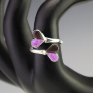 Zuni artists are known for their fine lapidary skills. Each stone is hand cut, polished, and set into a sterling silver setting. The ring is set with Mother of Pearl Shell and Pink Mussel stones. Weighs 2 grams. Size is adjustable. 5/16″ wide x 3/4″ long Zuni...