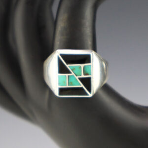 Zuni jewelry makers, Nancy and Sheldon Westika hand crafted this magnificent ring. Made out of sterling silver and inlaid with Kingman Turquoise and Jet. Zuni artists are known for their lapidary work. The Westikas have been making jewelry since the 1970’s and they are known for their fine inlay work. ...