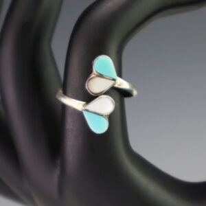 Zuni artists are known for their fine lapidary skills. Each stone is hand cut, polished, and set into a sterling silver setting. The ring is set with Mother of Pearl Shell and Turquoise stones. Weighs 2 grams. Size is adjustable. 5/16″ wide x 3/4″ long Zuni...