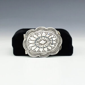 Take this money clip home for a wonderfully hand crafted accessory that show cases the craftsmanship of Navajo silversmithing. Hand made by Shirley Skeets. Backed with a nickle clip for stronger grip and durability. Weighs 24 grams. 1” wide x 1 3/4” tall Artist card included The...