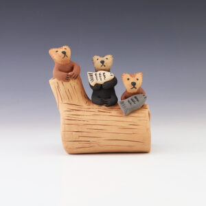 Jemez Pueblo potter Chrislyn Fragua made this pottery piece with three bear cubs on a log with fish. Chrislyn uses both the coil method and pinch method to create her pottery piece. Signed 4” tall x 3 7/8″ long x 2″ Artist card included The pottery is new...