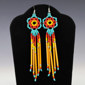 Gorgeous beaded earrings by Matilda Poyer. Great combination of colors. With ear wires are 2 1/8” in length. 1″ x 1 1/2″ Artist card included When trade beads were introduced to Native Americans, they made these colorful glass beads part of their jewelry. Over the years,...