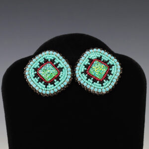 These beautiful beaded earrings will make a statement! Great colors and style. Hand made by Navajo artist Samantha Jackson. 1 5/16″ x 1 5/16″ Artist card included When trade beads were introduced to Native Americans, they made these colorful glass beads part of their...
