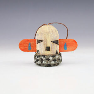 Marvin Jim hand carved this marvelous feather ornament out of wood. There is a Kachina hand painted on the face of the feather. Navajo folk art consists of figurines usually carved out of wood that depict Navajo life and culture. 5 1/8” long x 1 3/8” wide Artist card included...