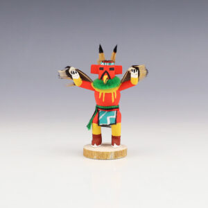 Hopi/Acoma artist Adrian Leon creates wonderful miniature kachinas, and this Parrot Kachina is no exception. Delicately carved and painted, this marvelous carving would be a great addition to your kachina or Native American art collection. Signed 2 3/8″ tall x 1 3/8″ long x 1 1/16” wide Artist...