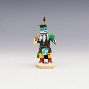 Hopi/Acoma artist Adrian Leon creates wonderful miniature kachinas, and this Crazy Rattle Kachina is no exception. Delicately carved and painted, this marvelous carving would be a great addition to your kachina or Native American art collection. Signed 2 5/8″ tall x 1 7/16″ long x 1 1/16” wide Artist...