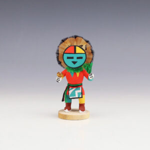 Hopi/Acoma artist Adrian Leon creates wonderful miniature kachinas, and this Sun Face Kachina is no exception. Delicately carved and painted, this marvelous carving would be a great addition to your kachina or Native American art collection. Signed 2 3/4″ tall x 1 1/2″ long x 1” wide Artist...