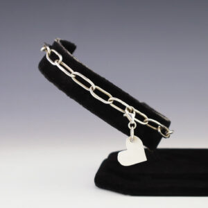 Zuni jeweler Carlo Lonjose hand crafted this lovely link bracelet. The bracelet is sterling silver and has a silver heart charm. Fits up to a 8 3/4″ wrist. Weighs 10 grams. Signed. 5/8″ wide x 9/16″ long-heart 3/16″ wide x 8 3/4″ long-bracelet Artist card included Zuni...