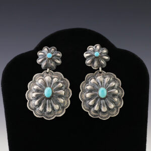 Lovely concho earrings hand made by Navajo artist Dale Morgan. The earrings are sterling silver and set with Turquoise stones. These fabulous earrings will become a versatile accessory in your jewelry collection. Weighs 22 grams. Signed. 1 5/8″ x 2 1/16″ 2 9/16″ long (including ear wire) Artist...