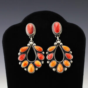 Beautiful earrings hand made out of sterling silver and Spiny Oyster by Navajo silversmith Selena Warner. These fabulous earrings will become a versatile accessory in your jewelry collection. (note-the shell has natural pitting) Weighs 10 grams. Signed. 1/2 x 1 7/8″ Artist card included The Navajos began...