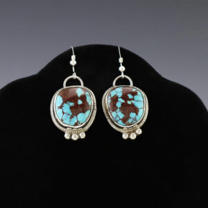 Lovely earrings hand made out of sterling silver and Turquoise. Hand made by Navajo silversmith Priscilla Smith. These fabulous earrings will become a versatile accessory in your jewelry collection. Weighs 6 grams. Signed. 9/16″ x 11/16″ Artist card included The Navajos began working with silver in the...
