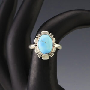 Lovely ring made out of sterling silver and set it with a Golden Hills Turquoise stone. It is a great representation of hand made Navajo jewelry. Size 6. Weighs 4 grams. 1/2″ wide x 5/8″ long Around 1865, a Navajo Blacksmith Atsidi Sani who admired the silver adornments...