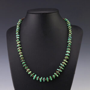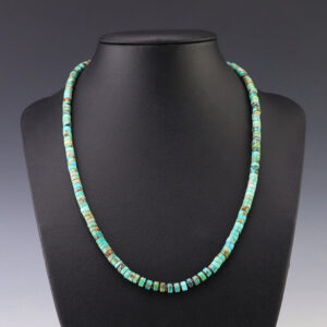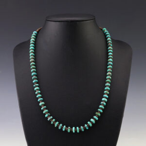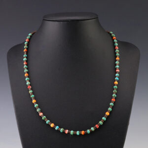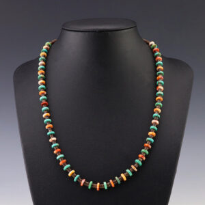 Amazing color combination! Kewa artist Lupe Lovato hand crafted this gorgeous necklace out of Turquoise and Spiny Oyster. Traditionally made by hand cutting, drilling, rolling, and stringing. Weighs 74 grams. A timeless beauty that you will enjoy for years to come. 3/16″ to 7/8″ wide 20 1/2” long ...