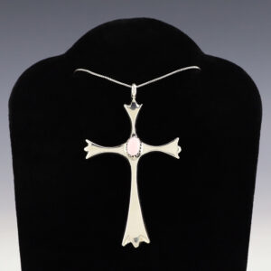 Navajo silversmith Harrison Yazzie made this lovely cross pendant out of sterling silver and Pink Coral A timeless beauty that you will enjoy for years to come. Weighs 6 grams. Signed. (Chain not included) 1 7/16” wide x 2 7/16” long Artist card included The...