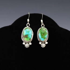 Lovely bead earrings hand made out of sterling silver and Turquoise by Navajo silversmith Samantha Martin. These wonderful earrings will become a versatile accessory in your jewelry collection. Weighs 6 grams. Signed 7/16″ x 1 1/4″ With ear wires are 1 13/16” in length Artist card included ...