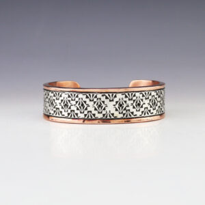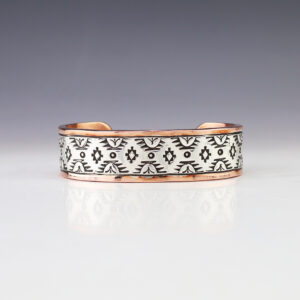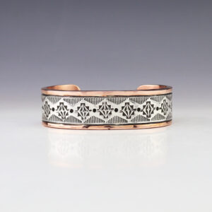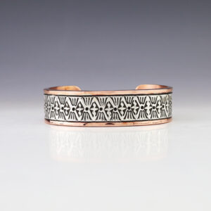 Navajo artists Randy Secatero and Sylvana Apache made this marvelous bracelet. Sterling silver and Copper with a traditional hand stamped design. Weighs 44 grams. The entire inner circumference is about 7 1/4”, including 1 1/8” opening. (Fits a 7 1/4″ wrist) Signed 3/8″ wide Artist card included ...