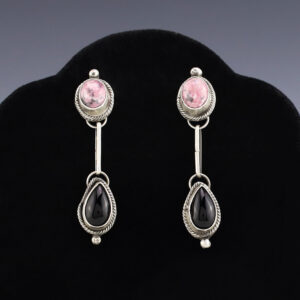 Lovely earrings made out of sterling silver and set with Rhodonite and Onyx stones. These fabulous earrings will become a versatile accessory in your jewelry collection. Weighs 14 grams. Signed. 1/2″ x 2 3/16″ The Navajos began working with silver in the 19th century, and began making things...