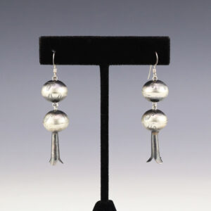Beautiful squash blossom earrings hand made out of sterling silver. Hand made by Navajo silversmith Preston Haley. These fabulous earrings will become a versatile accessory in your jewelry collection. Weighs 8 grams. 9/16″ x 1 3/4″ 2 1/8″ long (including ear wires) Artist card included The Navajos...