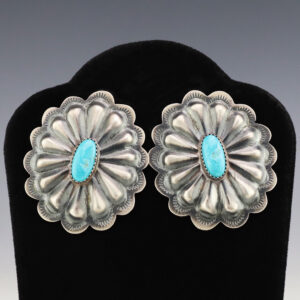 Lovely concho earrings hand made by Navajo artist Dale Morgan. The earrings are sterling silver and set with Turquoise stones. These fabulous earrings will become a versatile accessory in your jewelry collection. Weighs 22 grams. Signed. 1 5/8″ x 1 7/8″ Artist card included The Navajos began...