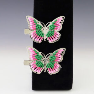 Gorgeous beaded butterfly earrings by Samantha Jackson. Great combination of colors. With ear wires are 2” in length 1 7/16″ x 1 5/16″ Artist card included When trade beads were introduced to Native Americans, they made these colorful glass beads part of their jewelry....