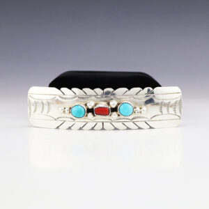 Great stamp work! Lovely barrette made out of sterling silver, Coral, and Turquoise. Great representation of Navajo silver work. Weighs 16 grams. 3/4” wide x 3 7/8” long Around 1865, a Navajo Blacksmith Atsidi Sani who admired the silver adornments that the Spaniards and their horses had. Atsidi Sani got...