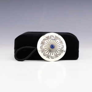 Great design! This ponytail holder is sterling silver with Lapis and made by Navajo artist Genevieve Blackgoat. Navajo barrettes and ponytail holders look absolutely amazing in your hair. Weighs 4 grams. Signed 1 3/8″ in diameter Artist card included The Navajos began working with silver in...