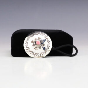 Great design! This ponytail holder is sterling silver with Pink Conch and made by Navajo artist Genevieve Blackgoat. Navajo barrettes and ponytail holders look absolutely amazing in your hair. Weighs 4 grams. Signed 1 3/8″ in diameter Artist card included The Navajos began working with silver...
