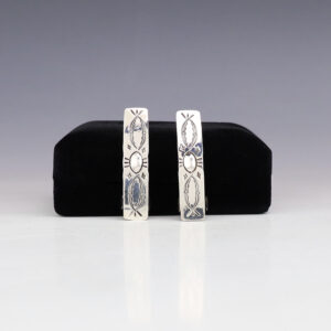 Great stamp work! Lovely barrettes made out of sterling silver by Navajo artist Bertha Begay Great representation of Navajo silver work. Each barrette weighs 4 grams. 3/8” wide x 1 5/8” long Artist card included Around 1865, a Navajo Blacksmith Atsidi Sani who admired the silver adornments...