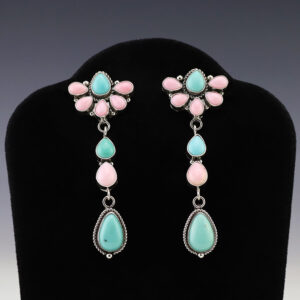 Beautiful earrings hand made out of sterling silver, Pink Conch, and Turquoise by Navajo artist Devin Brown. These wonderful earrings will become a versatile accessory in your jewelry collection. Weighs 14 grams. Signed 15/16″ x 1 3/16″ With ear wires are 1 13/16” in length Artist card...