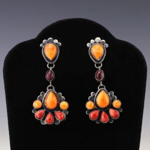 Beautiful earrings hand made out of sterling silver and Spiny Oyster by Navajo silversmith Selena Warner. These fabulous earrings will become a versatile accessory in your jewelry collection. (note-the shell has natural pitting) Weighs 10 grams. Signed. 3/4″ x 1 5/8″ Artist card included The Navajos began working with silver...