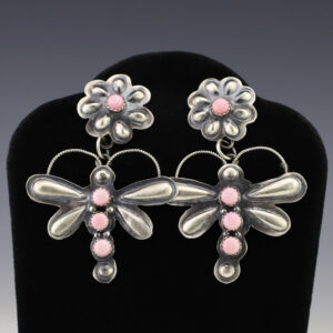Gorgeous Dragonfly earrings hand made out of sterling silver and Pink Conch by Navajo artist Gabrielle Yazzie. These wonderful earrings will become a versatile accessory in your jewelry collection. Weighs 12 grams. Signed 1 3/4” wide x 2 5/8” long Artist card included The Navajos...