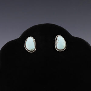 Beautiful post earrings hand made by Navajo silversmith Tawney Willie. The earrings are sterling silver and set with New Lander Variscite stones. These fabulous earrings will become a versatile accessory in your jewelry collection. Weighs 16 grams. Signed. 13/16″ x 1 7/16″ Artist card included The Navajos...