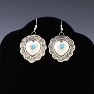 Lovely heart earrings hand made out of sterling silver and Turquoise. Hand made by Navajo silversmith Genevieve Blackgoat. These fabulous earrings will become a versatile accessory in your jewelry collection. Weighs 6 grams. Signed 1 1/16″ x 1 1/8″ With ear wires are 1 7/8” in length Artist...