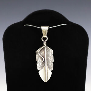 Navajo artist Chris Charley made this marvelous feather pendant out of sterling silver. (Chain not included) Weighs 6 grams. Signed 3/4” wide x 2 7/16” long Artist card included The Navajos began working with silver in the 19th century, and began making things like buckles,...