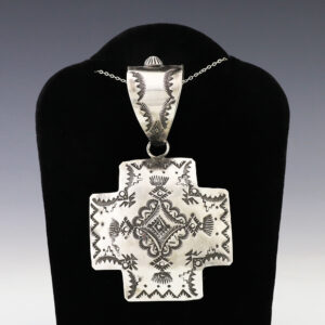 Navajo silversmith Vincent Platero handcrafted this beautiful cross pendant out of sterling silver. The pendant is hand stamped and has a satin finish. A timeless beauty that you will enjoy for years to come. Weighs 28 grams. Signed. (Chain not included) 2 1/16” wide x 3 1/8” long ...