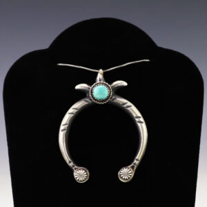 This timeless piece would be a great addition to your jewelry collection. Hand made by Navajo silversmith Martha Cayatineto. Sterling silver with Turquoise. (Chain not included) Weighs 16 grams. Signed 1 5/8” wide x 2 1/16” long Artist card included The Navajos began working with silver in the 19th century,...