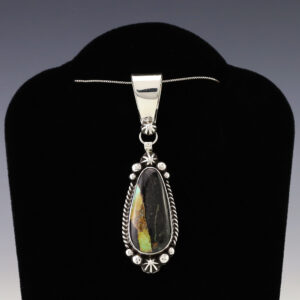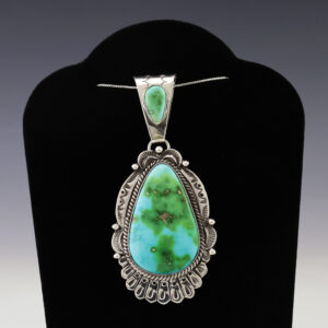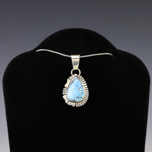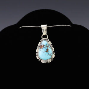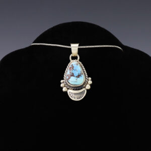 Beautiful pendant hand made out of sterling silver and Golden Hills Turquoise by Navajo artist Norvin Johnson. A timeless beauty that you will enjoy for years to come. Weighs 6 grams. Signed (Chain not included) 11/16” wide x 1 5/16” long Artist card included The...
